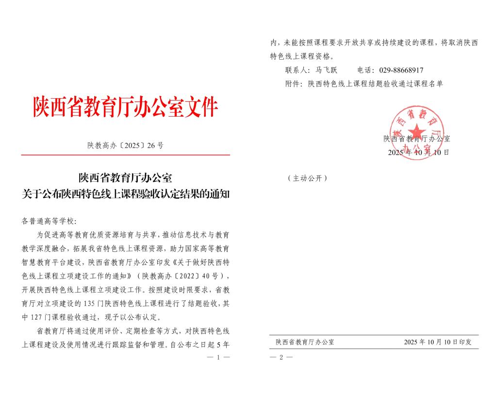 10月10日,陕西省教育厅办公室发布《关于公布陕西特色线上课程验收认定结果的通知》,由我们省级思政课“教学标兵”团队主持讲授的陕西特色线上课程《近代陕西历史人物十讲》顺利通过教育厅结项验收。