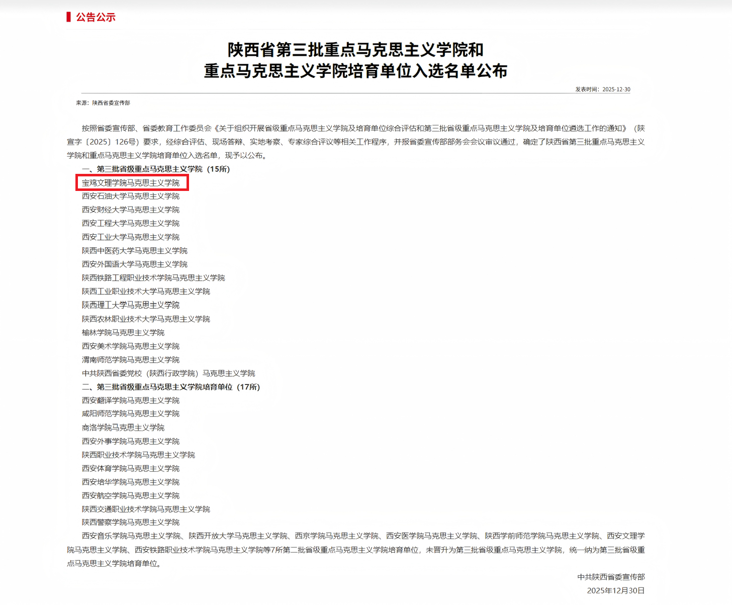 2025年12月30日,中共陕西省委宣传部公布《陕西省第三批重点伟德国际1946bv官网和重点伟德国际1946bv官网培育单位入选名单》。经省委宣传部、省委教育工作委员会组织专家综合评估、现场答辩、实地考察、综合评议等相关工作程序,我们伟德国际1946bv官网以综合考核第一名的成绩入选陕西省第三批重点伟德国际1946bv官网。