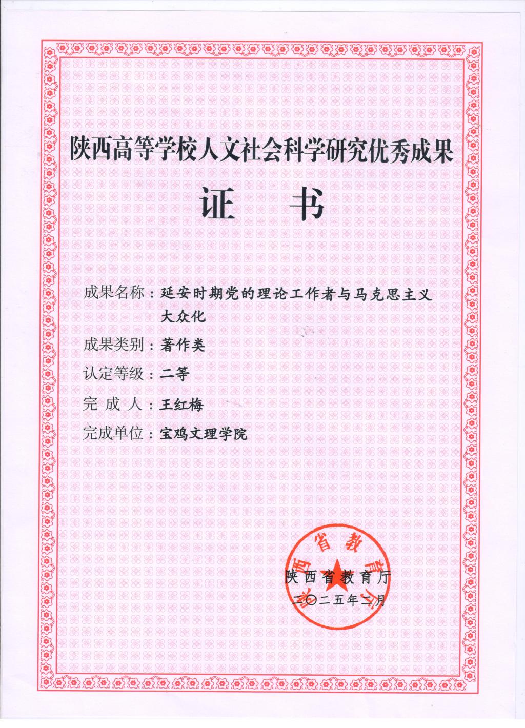 2月,陕西高等学校人文社会科学研究优秀成果奖揭晓,我们王红梅教授的著作《延安时期党的理论工作者与马克思主义大众化》获二等奖。