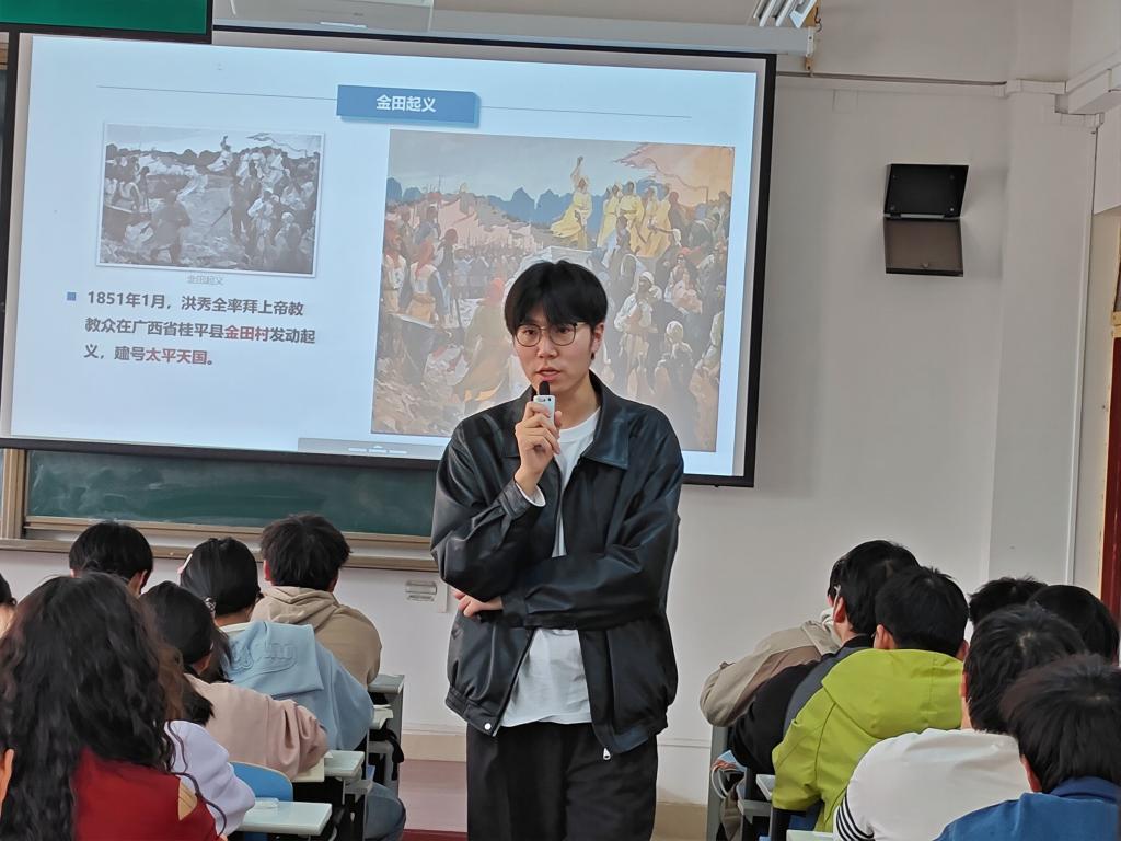 授课中,穆传威同学引用马克思的经典论述,自然导入本次授课主题——“太平天国运动”,该内容为本科生《中国近现代史纲要》课程第二章第一节的核心内容。授课过程中,他围绕太平天国运动的爆发背景、发展经过及最终结果展开讲解,重点剖析了其与以往农民运动的本质区别。通过深入解读《天朝田亩制度》与《资政新篇》的核心内容,清晰阐释了太平天国运动作为旧式农民运动最高峰的历史必然性;结合课堂互动,引导学生归纳出太平天国运动失败的主客观原因;同时,针对当下关于太平天国运动及洪秀全的各类错误评价,明确指出其错误实质,并指导学生运用辩证唯物主义观点进行科学评判。最后,他通过雨课堂推送练习题,巩固了教学内容,形成完整教学闭环。