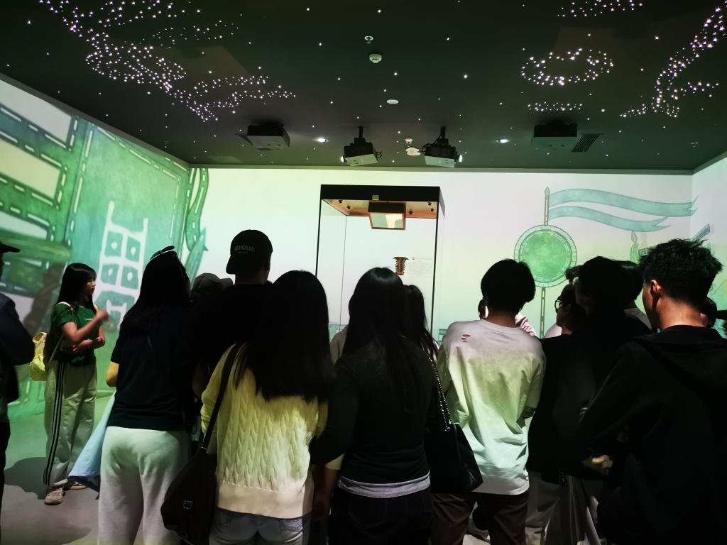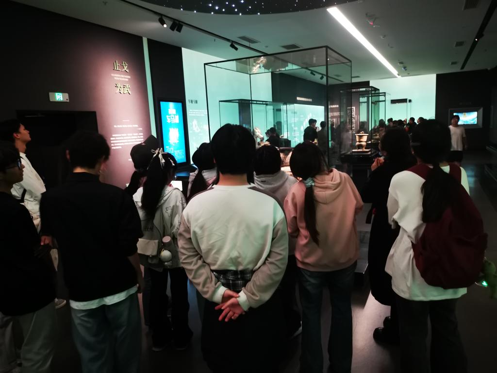 在讲解老师的带领下,同学们有序参观了各个展厅,认真观摩了何尊、逨鼎、折觥、秦公镈等珍贵文物,仔细聆听了“宅兹中国”、四十三年逨鼎中四个“毋敢”等铭文背后的故事,感受古人的匠心智慧以及周秦文化的博大精深。同学们通过近距离感受青铜文明,既增长了学识,还进一步增强了文化自信。