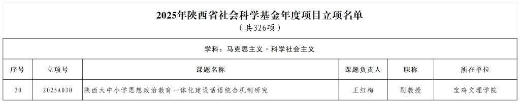 近日,陕西省哲学社会科学工作办公室公布了《2025年陕西省社会科学基金年度项目和“青博”项目立项名单》,我们王红梅副教授申报的课题《陕西大中小学思想政治教育一体化建设话语统合机制研究》获准立项。