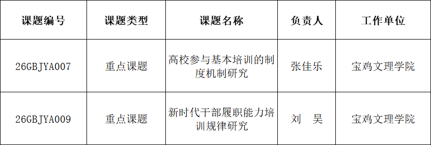 近日,延安大学官网发布了《关于2026年陕西省高等学校学科创新引智基地“干部教育国际交流引智基地”、陕西高校青年创新团队“红色资源与干部教育研究协同创新团队”联合开放课题立项的通知》,我们2024级硕士研究生刘昊、2025级硕士研究生张佳乐分别申报的“新时代干部履职能力培训规律研究”“高校参与基本培训的制度机制研究”课题获准立项。